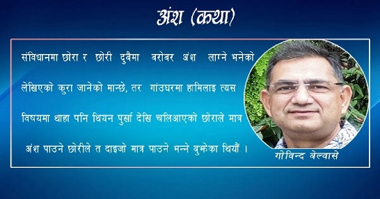 दशैँमा परिवार सितै भाइ गाउँमै आयो । धेरै वर्षपछि दशैँ संगै मनाउन पाएको खुवै खुसी लाग्यो । त्यो खुसीको धुनमा उसले घर किन्ने विषयमा नसोधेको पीर पनि विर्सि बसेँ । तर, टिकाका भोलिपल्ट अंश चाहियो भनेर माग्यो । भाइलाइ अंश दिनु त पर्यो नै भनेर आमालाइ बाँडिदिनुस भने । त्यही बेला घर किन्न थालेको छस रे जसरितसरि भाइबैनी हुर्काएँ बढाएँ । तर, भाइबाट धेरै आशा गरी बस्नु मेरो गल्ती स्वीकार गर्छु, भनेँ । मलाइ भनेरै घर किनेको भए चित्त दुख्ने थिएन भन्नु बाहेक अरू गुनासो गरिन । अंश लागेको उसको भागको जग्गा पनि खेती गरिखानुस हजुरलाइ चाहिए किन्नु होला नत्र अहिलेलाइ बेच्दिन काठ्माण्डौ तिरै बस्छु । एक दिन छुट्टिनै पर्छ अहिले अंश लगाम भनेको हो भनेर मलाइ सम्झाउने कोसिस गर्यो । घर किन्ने पैसा त छैन, साथीभाइहरू राम्रा छन्, घर किन्न थाले दुर्इ–चार करोड सापट दिन्छन् भनेर भन्यो । उसले कमाएको सम्पत्तीमा दाइलार्इ भाग लगाउन पर्छ भन्ने नियतले घर किन्ने कुरा लुकाएको भन्ने कुरा मलार्इ बुझाउन सफल भयो । अंश लगाएपछि हुनेखाने कान्छो छोरोसंग बस्न थालेकी आमाले एक–दुर्इ दिन विराएरै भए पनि फोन गर्नुहुन्छ । चित्त बुझेकै छ । खुसी नै लाग्छ ।
