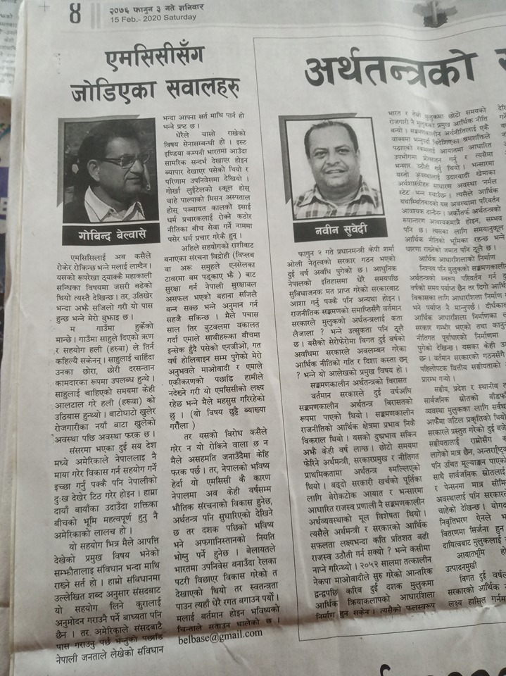 MCC लाइ अव कसैले रोकेर रोकिन्छ भन्ने मलाइ लाग्दैन । यसको रूपरेखा ठ्याक्कै महाकाली सन्धिका विषयमा जसरि बढेको थियो त्यस्तै देखिन्छ । तर, उतिखेर भन्दा अझै सजिलरि यो पास हुन्छ भन्ने मेरो बुझाइ छ । म गाउँमा हुर्केको मान्छे । गाउँमा साहुले दिएको ऋण र सहयोग हली (हरवा) ले तिर्न कहिल्यै सकेनन् । साहुलाइ चाहिँदा उनका छोरा, छोरी दरसन्तान कामदारका रूपमा उपलब्ध हुन्थे । साहुलाइ चाहिएको समयमा केही आलटाल गरे हली (हरूवा)को उठिबास हुन्थ्याे । बाटोघाटो खुलेर रोजगारीका नयाँ बाटा खुलेको अवस्था पछि अवस्था फरक छ । संसरमा भएका दुइ सय देश मध्ये अमेरिकाले नेपाललाइ नै माया गरेर विकास गर्न सहयोग गर्ने इच्छा गर्नु पक्कै पनि नेपालीको दुखः देखेर टिठ गरेर होइन । हाम्रा दायाँ वायाँका उदाउँदा शक्तिका बीचको भूमि महत्वपूर्ण हुनु नै अमेरिकाको लालच हो । यो सहयोग भित्र मैले आपत्ति देखेको प्रमुख विषय भनेको संझाैतालाइ सम्विधान भन्दा माथि राख्ने सर्त हो । हाम्रो संविधानमा उल्लेखित शब्द अनुसार संसदबाट यो सहयोग लिने कुरालाइ अनुमोदन गराउनै पर्ने बाध्यता पनि छैन । तर अमेरिकाले संसदबाटै पास गराउनु पर्छ भन्नुको पछाडि नेपाली जनताले लेखेको संविधान भन्दा आफ्ना सर्त माथि पार्न हो भन्ने प्रष्ट छ । धरैले चासो राखेको विषय सेनासंबन्धी हो । इस्ट इण्डिया कम्पनी भारतमा आउँदा सामरिक सन्दर्भ देखाएर होइन ब्यापार देखाएर पसेको थियो र परिणाम उपनिवेसमा देखियो । गोर्खा लुइटेलको स्कूल होस चाहे पाल्पाको मिसन अस्पताल होस पञ्चायत कालको इसाइ धर्म प्रचारकलाइ रोक्ने कठोर नीतिका वीच सेवा गर्ने नाममा पसेर धर्म प्रचार गरेकै हुन । अहिले सहयोगको राशीबाट बनाएका संरचना विद्रोही (विप्लब वा अरू समुहले एनसेलका टावरमा बम पड्काए झै )बाट सुरक्षा गर्न नेपाली सुरक्षाबल असफल भएको बहाना सजिलै बन्न सक्छ भन्ने अनुमान गर्न सहजै सकिन्छ । मैले पचास साल तिर बुटवलमा वकालत गर्दा एमाले साथीहरूका बीचमा इन्सेक हुँदै पसेको एनजीऔ, गत वर्ष होलिवाइन सम्म पुगेको मेरो अनुभवले माऔबादी र एमाले एकीकरणको पछाडि हामीले नदेख्ने गरी यो MCC को लक्ष्य रहेछ भन्ने मैले महसुस गरिरहेको छु । (यो विषय छुट्टै ब्याख्या गराैँला ) तर यसको विरोध कसैले गरेर न यो रोकिने वाला छ न मैले असहमति जनाउँदैमा केहि फरक पर्छ । तर, नेपालको भविष्य हेर्दा यो MCC कै कारण नेपालमा अव केही वर्षसम्म भाैतिक संरचनाको विकास हुनेछ, अर्थतन्त्र पनि सुधारिएको देखिने छ तर दशक पछिको भविष्य भने अफ्गानिस्तानको नियति भोग्नु पर्ने हुने छ । बेलायतले भारतमा उपनिवेस बनाउँदा रेलका पटरी विछाएर विकास गरेको त देखाएको थियो तर स्वतन्त्रता पाउन त्यहाँ धेरै रगत बगाउन पर्यो । मलाइ बर्तमान होइन भविष्यको चि