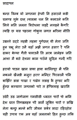 हरायो पाउन खान सफा हावा कान्तिपूर मै पनि नबज्ने खैजडी मजुरा हराए मन्दिर पिरसरमै पनि बाझिँए डाडा पाखा र पखेरू लडाइ कै हुण्डर भरि हुँन्छ कल्याण जगतको पारे त हेप्निलाइ खरानि