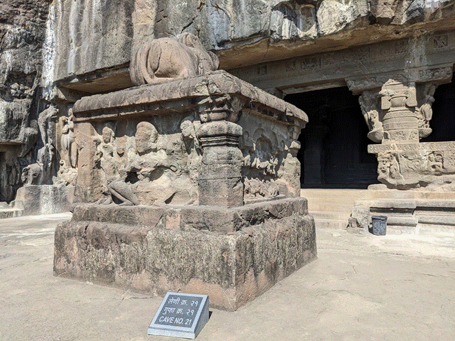 विश्व विख्यात नटराजको थ्री डायमेन्सनको मुर्ति पनि १६ नं. कै बीचको भागको मुल संरचनामा छ । कैलास द्वार भनेर परिचित चट्टान कुदिएको कलापूर्ण ढोकाबाट पर्यटकहरू छिर्न पर्छ । वरिपरिको फराकिला कोठारूपी स्थानलार्इ जोगाउन कतिपय नयाँ पिलर जोडिएका छन् । नयाँ थपिएका पिलर पछि सम्भार गर्न थपिएका हुन भन्ने प्रष्ट बुझिन्छ । बीचको मुल संरचना हेर्दा मलार्इ भने पशुपतिनाथको संरचना याद आयो । पशुपतिमा एकातिर तबला र हार्मुनियम बजाउँदै भजन गाउँदै गरेका भक्तजन बस्ने पाटी छ । त्यस्तै चट्टान खोपिएका पाटी त्यहाँ पनि रहेछन् । पर्यटक र त्यहाँका कर्मचारी मात्र देखिए त्यहाँ । भजन गाउने भक्तजन भेटिएनन् । सायद पहिले पुजा अर्चना गरेर भजन गाउनेहरू त्यता रमाइरहेका हुन्थे ।