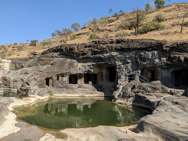 त्यो डाँडाको टुप्पोमा पानीको कुण्ड देखियो । सफा पानी नीलो थुप्रिएको कुण्डको तीन तिर गुफा रहेछन् । ती गुफाका संरचनामा भने गणेशका मुर्ति कुदिएका भेटिए । १७ नम्बर पछिका गुफामा गणेशको बाहुल्यता देखियो । १६ नम्बरसम्म त्यसरि गणेशका मुर्तिलार्इ महत्व दिएर कुदेको भेटिन ।